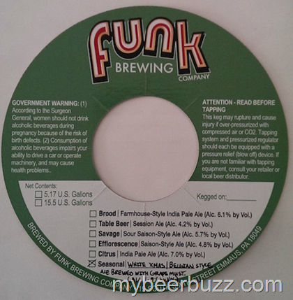 Here’s a new brew coming from Funk Brewing in Emmaus, PA. This is White Xmas