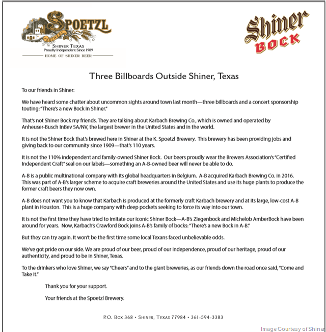 Spoetzl Brewery Fires Back at Anheuser-Busch in Open Letter to Citizens of Shiner