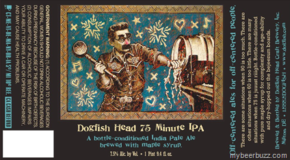 So finally Squall gets it’s own name…yes I know what you’re screaming but I couldn’t resist.  Here it is (finally)….Dogfish Head 75-Min IPA….but wait…it’s bottle conditioned and wait…what…it’s brewed with Maple Syrup?!  OK I’ll try it for myself….7.5% ABV 750ml embossed big bottle….it’s got to be good….wait…make that juuust riiight (half way between 60 and 90)!