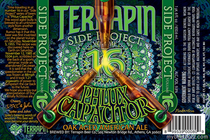 Back on April 1st 2011, our pal Spike Buckowski from Terrapin Beer gave us the inside details on Side Project 16 and that it would be named Phluz Capacitor…and here it is. Click HERE if you want to see the video. Phlux Capacitor is an Oak Aged American Ale and yes it’s Side Project # 16, 9.8% ABV and it will be packaged in 22oz bottles. Of course it’s an unknown style with over 1.21 gigawatts!