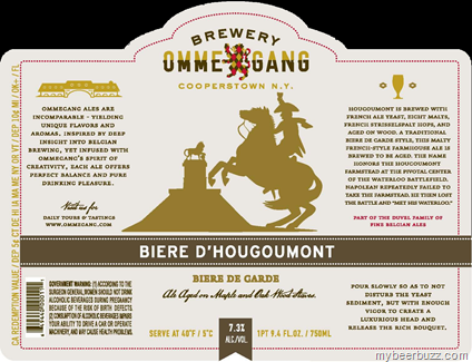 We delivered the keg label and now we have the actual 750ml bottle label for Brewery Ommegang Biere D’Hougoumont Biere De Garde (ale aged on maple & oak wood staves.) This new brew from our friend Phil Leinhart uses French ale yeast, 8 malts, French Streisselspalt hops & the name honors the Hougoumont Farmstead at “the pivotal center of the Waterloo battlefield…Napoleon repeatedly failed to take the Farmstead, he then lost the battle & met his Waterloo.” This new brew will be 7.2% ABV and I believe it is one of the first packages to carry a QR code from Ommegang too.