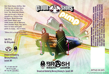 Here’s the new 22oz bottle label for the Clown Shoes / Brash Brewing Co Pimp Double Brown Ale. Both Clown Shoes & Brash Brewing are brewed @ Mercury Brewing Co…each brewery made their own brown ale and the two were blended to form Pimp.
