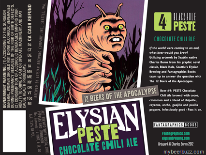 Here’s the 4th beer in the Elysian Brewing 12-Beers of the Apocalypse series. Up today we have Peste Chocolate Chili Ale. Peste is Spanish for “over” and I’m not sure I can get over the creepy Fantagraphics caterpillar (with teeth) on the label. Peste is 7% ABV and brewed with cocoa, cinnamon & a blend of chipotle, cayenne, ancho, guajillo & Passilla chili peppers and it will be packaged in 22oz bottles. As a bonus here's the bottle & keg-label for Elysian Split Shot Espresso Milk Stout. (22oa 7.25% ABV—Seattle Produced Lighthouse Coffee added)…and the Official Beer of 2012 Seattle Beer Week.