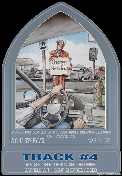 Here’s the label for Lost Abbey’s Track#4 from their Ultimate Box Set. Track # 4 is an ale aged in bourbon & red wine barrels w/sour cherries added and it’s a BIG 11.33% ABV. Look for the 12.7oz bottles to be released at the brewery April 21st (Event details HERE.) The making of Track # 4 vide is here and details on the Ultimate Box Set are here.