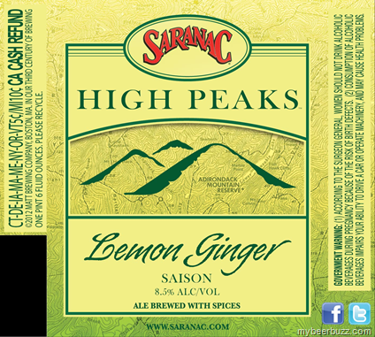 Here’s a new Saranac High Peaks Series brew called Lemon Ginger Saison. This 12oz bottled 8.5% Saison is actually brewed at the Harpoon facility in Boston, MA and it uses vanguard & Czech Saaz hops.