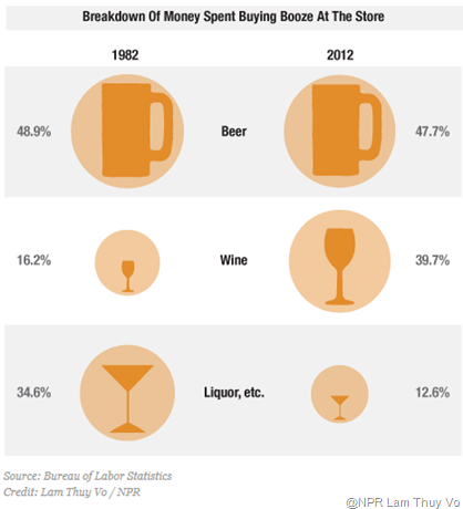 A great story on NPR comparing what we spent on alcohol in 1982 versus what we spend now in 2012. The report highlights where we spend our money (bars versus stores), how the price has changed at east over the last 20 years, and of the portion we spend at stores, what are we buying (the graphic above). Interesting to note that a) we are spending more of our money at stores for home consumption, b) store prices have decreased while bar prices have increased almost 80%, and c) wine has seen the largest store purchase increase compared to beer & liquor which have both decreased since 1982. The full article is interesting and can be found here….and yes I’m doing my part to get beer in-store purchases to increase.