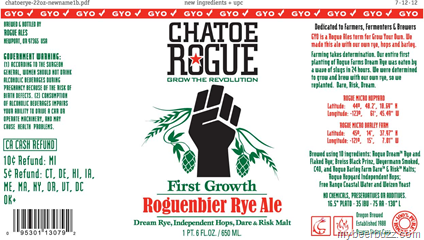 Here’s a new Rogue beer from the Chatoe Rogue First Growth series called Roguenbier Rye Ale. This beer uses Rogue Farms Dream Rye, Independent Hops as well as Dare & Risk malt. Roguenbier Rye Ale will be packaged in 22oz bottles and come in at 6.6% ABV. The label relates the story of Rogue Farms Dream Rye being eaten by slugs in 24 hours (and subsequent replanting), the longitude & latitude of the farm fields for each crop and even a note that this beer uses Weizen Yeast instead of their regular Pac Man yeast.