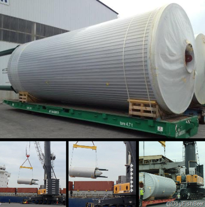 Here are a few pictured courtesy of Dogfish Head showing some of their 10 additional 600bbl fermentation tanks being unloaded in Baltimore harbor.