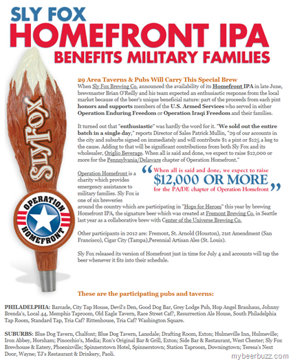 The details on this beer release are here and the details on the event are here. We’ve see Saint Arnold and Cigar City participating (here and here) and I’m very happy to see Sly Fox joining in the Operation Homefront program.