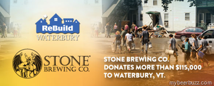 ESCONDIDO, Calif. (August 27, 2012/mbb/) – Stone Brewing Co. has donated $86,373.61 to ReBuild Waterbury and $30,000 to Waterbury Good Neighbor Fund for efforts to restore Waterbury, Vt., a community that was damaged by Tropical Storm Irene in 2011.  The proceeds are from the sale of the collaboration beer, The Alchemist / Ninkasi / Stone More Brown Than Black IPA, brewed in December 2011 with Ninkasi Brewing Company in Eugene, Ore. and The Alchemist Pub and Brewery in Waterbury.  The beer was sold in 17 states, including Vermont.