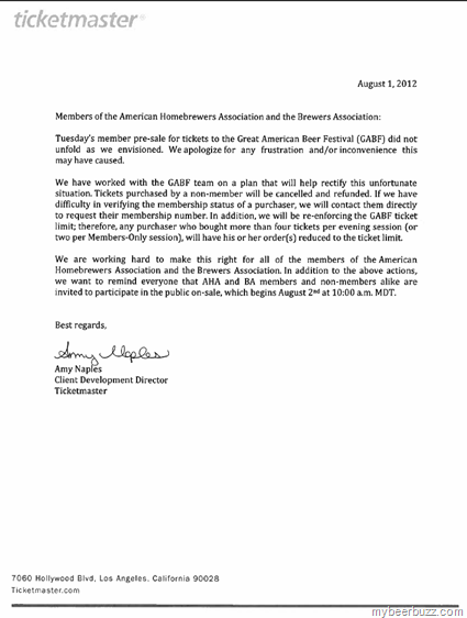 Ticketmaster just issued the above letter of apology to the GABF for the ticketing mess yesterday. Hopefully in the end this will work out for everyone who experienced the problems yesterday. As a side note, the GABF is reporting approximately 21 tickets were sold to non-members.