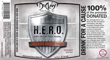 Here’s the 2012 label for DuClaw H.E.R.O. Chocolate Chipotle Stout. The story of this year’s H.E.R.O. winners Vincent & Suzanne Powers is here and look for a 10/24 brewpub release (bottles & draft available now in Maryland). H.E.R.O will be packaged in 22oz bottles, come in at 7.5% ABV and all proceeds are donated to charity.