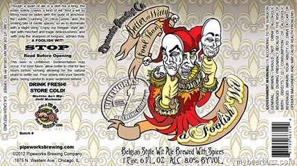 Here’s a new one from Pipeworks called A Foolish Wit…or for the full title…Better a witty fool than a foolish wit. This Belgian-style wit will be packaged in 22oz bottles and come in at 8% ABV.
