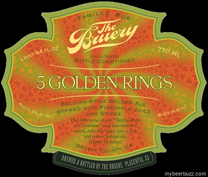 Yesterday we brought you The Bruery 5 Golden Rings keg label, and now today as expected we have the 750ml bottle.  This is the 5th release in The Bruery’s 12-Days of Christmas Series and it is a Belgian-Style golden ale brewed with pineapple juice & spices.  This beer “incorporates sweet cake-like spice into a rich & robust golden ale” and it comes in at 11.5% ABV.