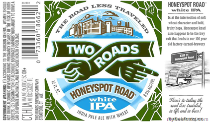 Here’s another new 12oz bottle coming from Two Roads Brewing called Honeyspot Road White IPA--India Pale Ale brewed with wheat. This beer will come in at 6% ABV and it is named after the highway exit that leads to the “100 year old factory turned brewery” that is Two Roads Brewing.