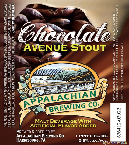 Here’s a new one from our pal Artie Tafoya at Appalachian Brewing Co called Chocolate Avenue Stout--malt beverage with artificial flavor added. This new brew will be packaged in 22oz bottles and come in at 5.8% ABV. Stay tuned for release details.