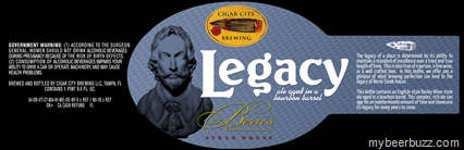Here’s your first peek at an interesting new beer brewed by Cigar City for Bern’s Steak House called Legacy--ale aged in a bourbon barrel. Legacy is an English-style Barley wine aged in bourbon barrels, it will be packaged in 750ml bottles and no word on the ABV so far.