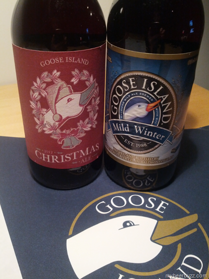 A wonderful Christmas surprise arrived from Goose Island, so Mrs. BeerBuzz & I decided to start the holiday weekend off with a tasting. Tonight we decided the weather was perfect to sample these two seasonal Goose Island brews, so with the snow flakes flying and the fireplace in full gear, we broke out a Goose Island Mild Winter and Christmas Ale 2012.