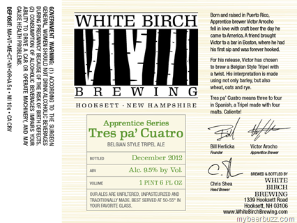 White Birch Brewing is bringing us another new Apprentice Series beer today as they gain approval for their Tres pa’ Cuatro Belgian Style Tripel. This beer is the creation of apprentice Victor Arocho and it is a Belgian Tripel that uses Barley, wheat, oats and rye in the malt so it should be interesting. This limited run beer will be packaged in 22oz bottles and come in at 9.5% ABV.
