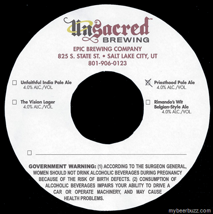 Here’s an interesting set of keg releases coming from Utah’s Epic Brewing for a venture they are calling Unsacred Brewing. Today we have keg releases for Priesthood Pale Ale (4% ABV), The Vision Lager (4% ABV), Unfaithful IPA (4% ABV) & Rimando’s Wit Belgian-Style ale (4% ABV)---named after Real Salt Lake Soccer Goalie Nick Rimando. Keep in mind that under Utah state law, beers may only contain 4%ABV or less whish may explain the coincidental ABV figures.