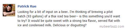 Patrick Rue of The Bruery is posting on Facebook to ask about the possibility of brewing a Thai Iced Tea Beer…this from Patrick: