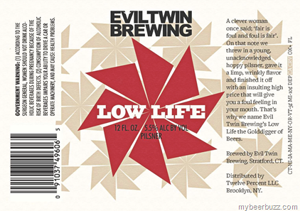 Today we get to see the 12oz bottle label for Evil Twin Low Life Pilsner. This beer will be brewed by Two Roads Brewing and it will come in at 5.5% ABV. So how did it get the name Low Life? Well according to the label…we threw in a young unacknowledged hoppy pilsner, gave it a limp, wrinkly flavor and finished it off with an insulting high price that will give you a foul feeling in your mouth. That’s why we name Evil Twin Brewing’s Low Life the Golddigger of beers.”