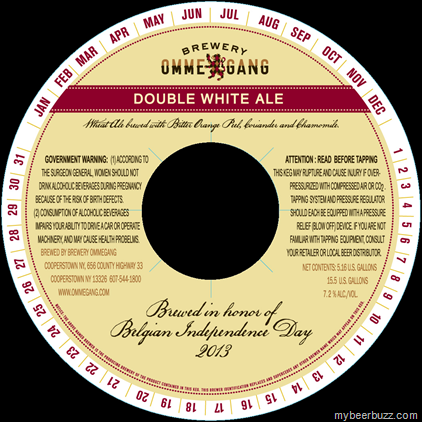 Here’s and interesting new keg label for Brewery Ommegang Double White Ale--brewed with bitter orange peel, coriander and chamomile.  This beer is brewed for Belgian Independence Day 2013.