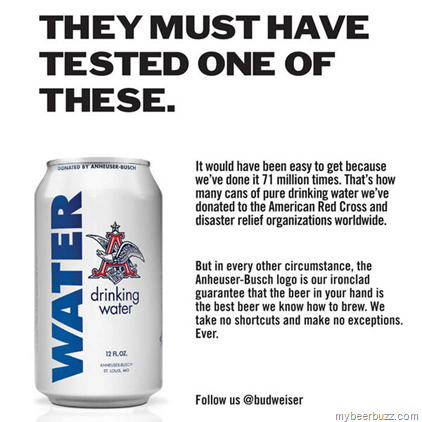Here’s a peek at the ad campaign Anheuser-Busch is running in response to the lawsuits claiming they have watered down their beer. This full-page ad is running nationally in newspapers like the New York Times and it shows a canned water that Anheuser-Bush distributes to national disasters. In the end I suspect these lawsuits will only serve to allow Anheuser-Busch to confront not only the lawsuit claims themselves but also what I think many craft-beer “enthusiasts” have been claiming about AB all along….AND AB gets a not-so-subtle reminder in about their community & disaster support efforts on the front pages of a lot of publications.