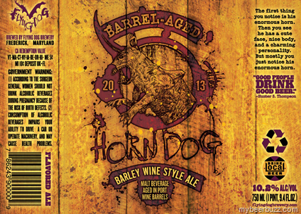 We brought you news of the 3/26 release from Flying Dog for their Barrel-Aged Horn Dog Barleywine 2013…and now we get to see the actual approved label.  Flying Dog Barrel-Aged Horn Dog was aged in Port Wine barrels, it will be packaged in 750ml bottles and come in at a big 10.2% ABV so pay attention to the horn!