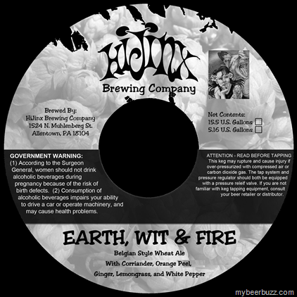 Here’s a new keg label coming from our pals Curt Keck & Chris Becker at HiJinx Brewing in Allentown, PA.  Earth Wit & Fire is a Belgian-Style Wheat ale with coriander, orange peel, Ginger, Lemongrass and White Pepper.