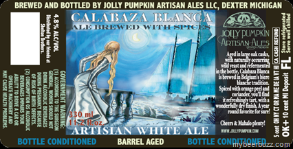 Today you get your first look at the label for Jolly Pumpkin Calabaza Blanca Artisian White Ale. This ale brewed with spices will be bottle conditioned and barrel aged and it’s actually being packaged in a smaller 11.2oz bottle by Jolly Pumpkin. This beer is aged in large oak casks using wild yeast and it is spiced with orange peel & coriander. Look for Calabaza Blanca to come in at 4.8% ABV.