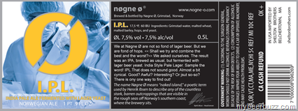 Today we have the Nogne 0 16.9oz bottle label for I.P.L.--India Pale Ale fermented with Lager yeast. This beer is 60 IBU and 7.5% ABV. .