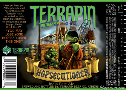 Today we get to see the updated 12oz bottle label for Terrapin Hopsecutioner. This appears to be the label used in the 12-pack packaging and it remains at 7.3% ABV. .