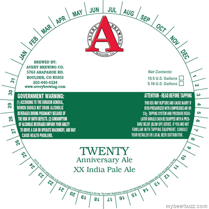 These are keg-only so far but today we get a peek at the label for Avery Brewing Twenty Anniversary Ale XX IPA & Out of Mind Stout with Coffee added (6.1% ABV).