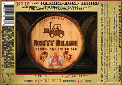 image Today we get to see the apostrophe's gone wild with release No 16 in the Avery Brewing Barrel-Aged Series.  This is Ross’s’s’ Melange Barrel-Aged Wild Ale and no that’s not a typo.  Ross’s’s’ Melange I an ale brewed with grape must and aged in Chardonnay barrels, it will be packaged in 12oz bottles (limited to 105 cases)and come in at 7.89% ABV.  I’m sure there’s a story behind the multiple apostrophe’s, but based on the label I’d say Ross is their pessimistic warehouse forklift operator.