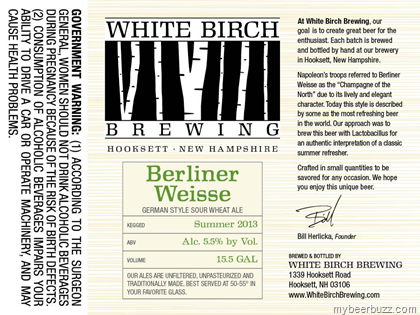 White Birch Berliner Weisse is a classic German-style sour wheat ale that uses Lactobacillus. This is the keg packaging, it will come in at 5.5% ABV and look for a spring/summer release.