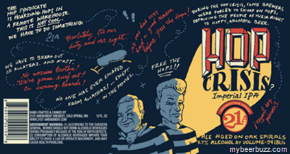 For the third year running, 21st Amendment Brewery announced the release of Hop Crisis, a big, hoppy, oak-aged Imperial IPA that is packed with five different hop varietals. Hop Crisis was created in defiance of the 2007 hop shortage at a time when many brewers were forced to skimp on hops. This year the formula adds new dry hops in the form of New Zealand Motueka and Australian Stella blended with Northwest Cascade hops.