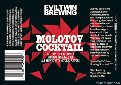 Here’s a peek at the label for Evil Twin Molotov Cocktail Imperial IPA.  This beer will be packaged in 12oz bottles at Two Roads Brewing in Stratford, CT and it will come in at 13% ABV.