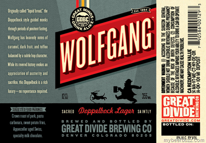 We brought you the 22oz label last year, and this morning we get to see the new 12oz bottle for Great Divide Wolfgang Dopplebock Lager. This beer remains at 8% ABV.