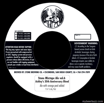 Here’s a peek at the next volume of Stone Brewing’s Mixtape series of beers. This is volume 6 and it is called Ashley’s 30th Anniversary Blend. The Ale with orange peel added will come in at a BIG 9.4% ABV.