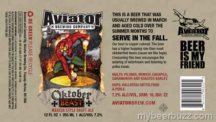 Today we get a peek at the label for Aviator Brewing Oktober Beast. This Marzen style draft Ale has a higher than normal hop content for most Okto beers at 22 IBU using Hallertau, Perle and Mittelfruh hops. Look for Oktober Beast to come in at 7.2% ABV.