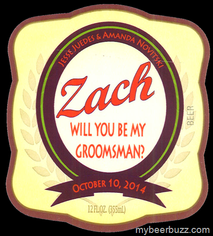 I love bringing you the Stevens Point Private Stock labels. These labels are from small batch custom brews usually for weddings and conventions, and today we get to see Zach Will You Be My Groomsman? Beer. and this one appears to be for the wedding of Jesse Juedes & Amanda Novitski on Oct 10, 2014. This is a 12oz bottle and Congratulations Zach!