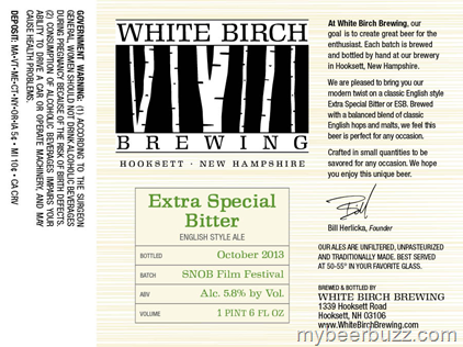 Today we get to see the 22oz bottle label for White Birch Brewing Extra Special Bitter.  This English Style Ale is packaged for the SNOB Film Festival and it will use English hops and malts and come in at 5.8% ABV.  Look for an Cot 2013 bottling.