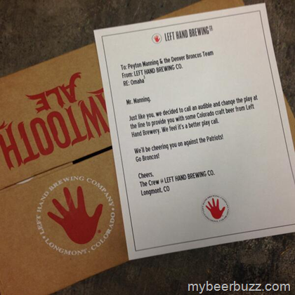 On the heels of the Denver Bronco’s playoff win, apparently Peyton Manning was quoted saying, “What’s weighing on my mind is how soon I can get a Bud Light in my mouth after this win.” Instead, Left Hand Brewing shipped off the above case of Sawtooth Ale to Peyton Manning with this caption: