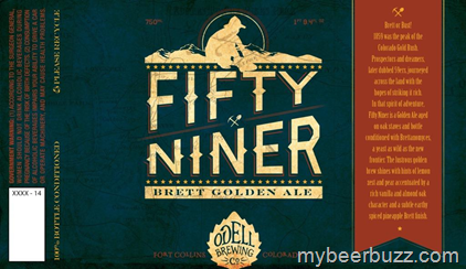 Here’s a new beer coming to bottles from Odell Brewing. This is Fifty Niner and it is a Brett Golden Ale. Fifty Niner is named for the miners who launched the gold rush in 1859 and it is a golden ale aged on oak staves and conditioned with Brett yeast. This beer will be packaged in 750ml bottles.