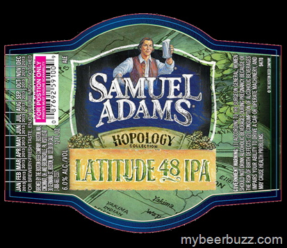 This is the 2014 Hopology Collection label for Samuel Adams Latitude 48 IPA. This beer uses 5 hop varieties (Zeus, Simcoe, East Kent Goldings, Mosaic & Hallertau Mittelfrueh) and it will come in at 6% ABV.
