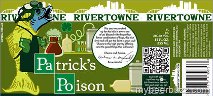 Here’s your first look at a new can coming from Rivertowne Brewing.  This is Patrick’s Poison and surprisingly enough, the TTB approved a name with “poison” in it.  This beer is an Irish Style Imperial Red Ale (just in time for St. Patrick’s Day), it will be package din 12oz cans and come in at 8% ABV.