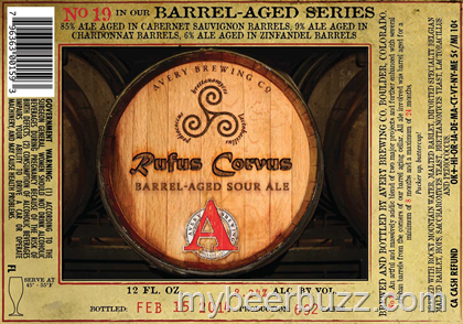 Today we get to see TWO new beers coming from the Avery Brewing Barrel-Aged Series. This is release No 19 and it is named Rufus Corvus Barrel-Aged Sour. This beer is 85% ale aged in Cabernet Sauvignon barrels, 9& Ale aged in Chardonnay barrels and 6% ale aged in Zinfandel barrels (all a minimum of 8 -24 months). Look for Rufus Corvus to be packaged in 12oz bottles (692 cases) and come in at 8.24% ABV. From Avery: