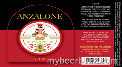 Here’s a beer called Anzalone Special Beer. This Lager is brewed and bottled by Lancaster Brewing and it is meant to mimic the historic Kaier’s Lager.
