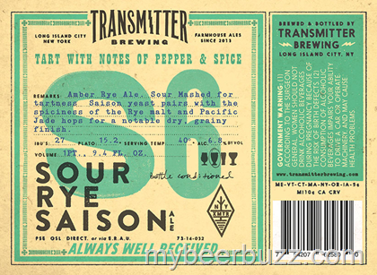 Transmitter Brewing (Long Island, NY) - S6 Sour Rye Saison (750ml bottle, 6.8% ABV, 27 IBU). .